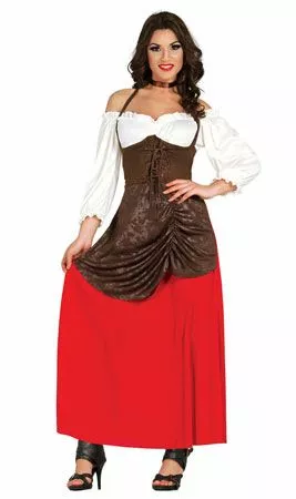 Con este disfraz de Tabernera Elena para mujer podrás convertirte en una linda Campesina, Mesonera o Posadera Medieval y disfrutar vestida de época en tus Fiestas Temáticas, Ferias y Mercados Medievales o en el Carnaval.